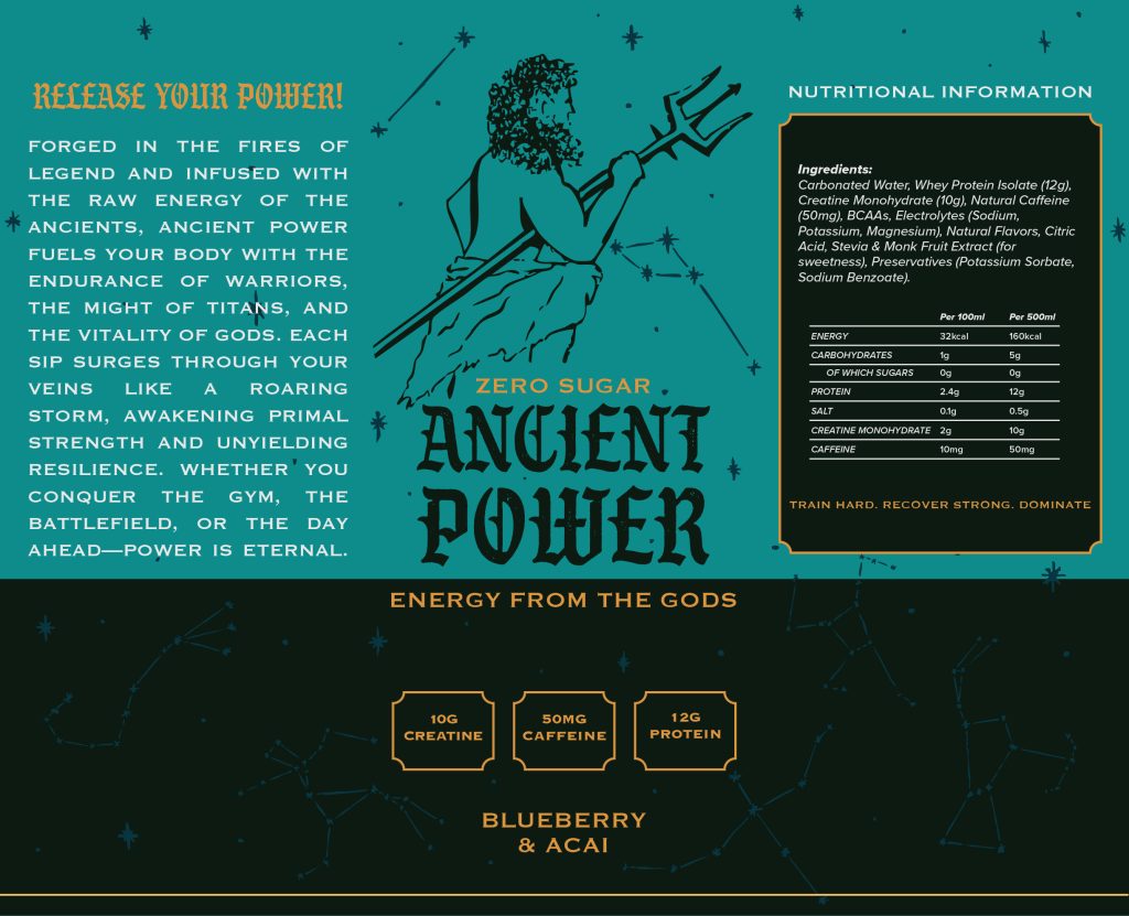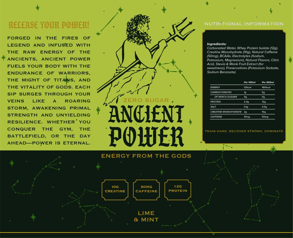 The first step taken in the design process was to create a brand name and concept for my chosen project, which was an energy drink brand targeted toward consumers over the age of 60. Establishing a clear brand direction was essential, as it would allow me to develop a conceptual idea that aligns with the core identity and messaging of the brand. The brand was named ‘Ancient Power’—a pre-workout energy drink designed specifically for elderly gym-goers, with a thematic focus on mythology and astrology. The concept aimed to challenge conventional perceptions of ageing by promoting strength, vitality, and wisdom.