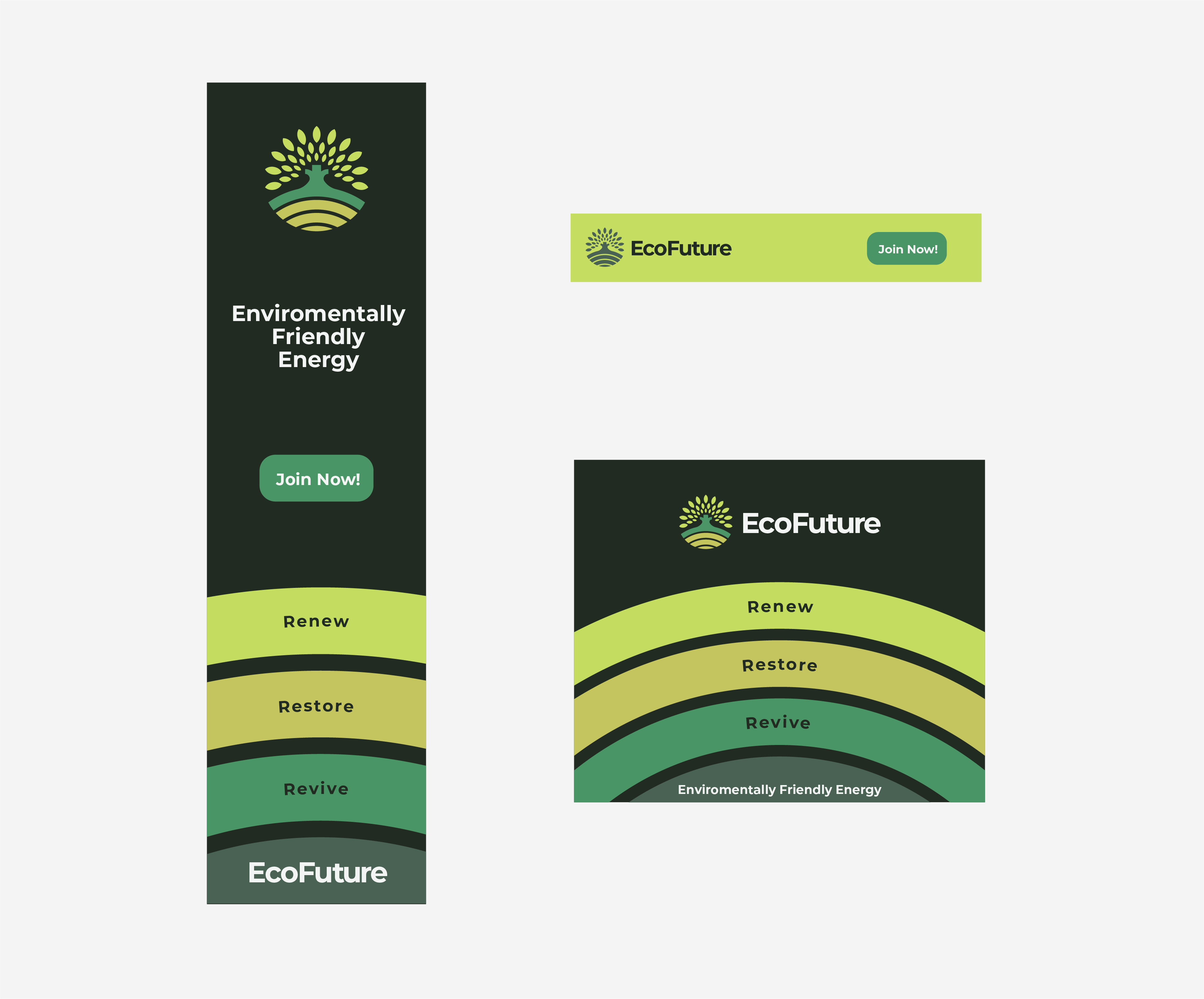 While creating the banners I came up with the slogan ‘Renew, Restore, Revive’ which pairs elegantly with the 3 rings and gives the viewer a clear and catchy indication of what EcoFuture is all about. The skyscraper web banner and the mobile banner were the 2 banners that came with the most limitations when designing, due to narrow width and height, the information had to be strategically placed without the composition looking overcrowded or being too small to read, which is where the use of colour came in to help with clear legibility. The skyscraper advertisement began to look even more crowded when including the logotype underneath the icon, so I opted to place it at the bottom of the advertisement instead; the initial thought was to remove the logotype from the banner but thought it was imperative to keep it in to improve the brand recognition and the effectiveness of the advertisement.