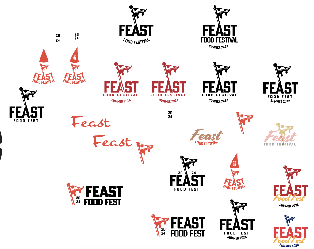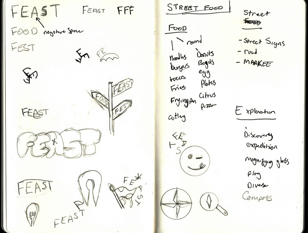 When I set out to create a conceptual logo for ‘Feast food festival’ I didn’t have a clear path of the direction I wanted it to take, I begin to take inspiration from my conceptual logo that I created on my development research blog and how I could look at incorporating food elements into the type. I started my process digitally, by looking at how the letter forms worked in different fonts for the word ‘Feast’ but I didn’t really find any directions that I wanted to further explore. I then moved back over to pencil and paper which allowed me to properly collect my thoughts and ideas so I could have a clearer understanding of the design direction my logo would take.