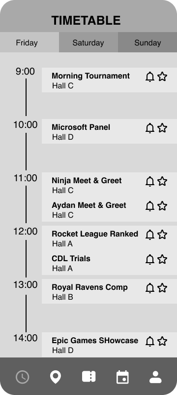 On the timetable page, a few features have been added and the interface has been improved to not only fit within the grid but to also streamline information and look more visually appealing, The addition of a favourites icon allows users to save their favourite events, which can then be found on their profile page, this allows them to take control of the content they want to see in one place. Another feature is a notification icon, which would send a notification to the user’s phone so that they don’t miss an event.