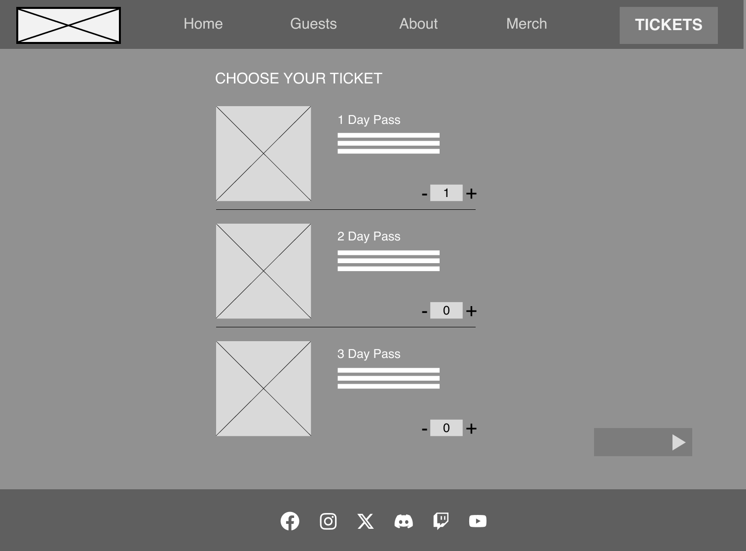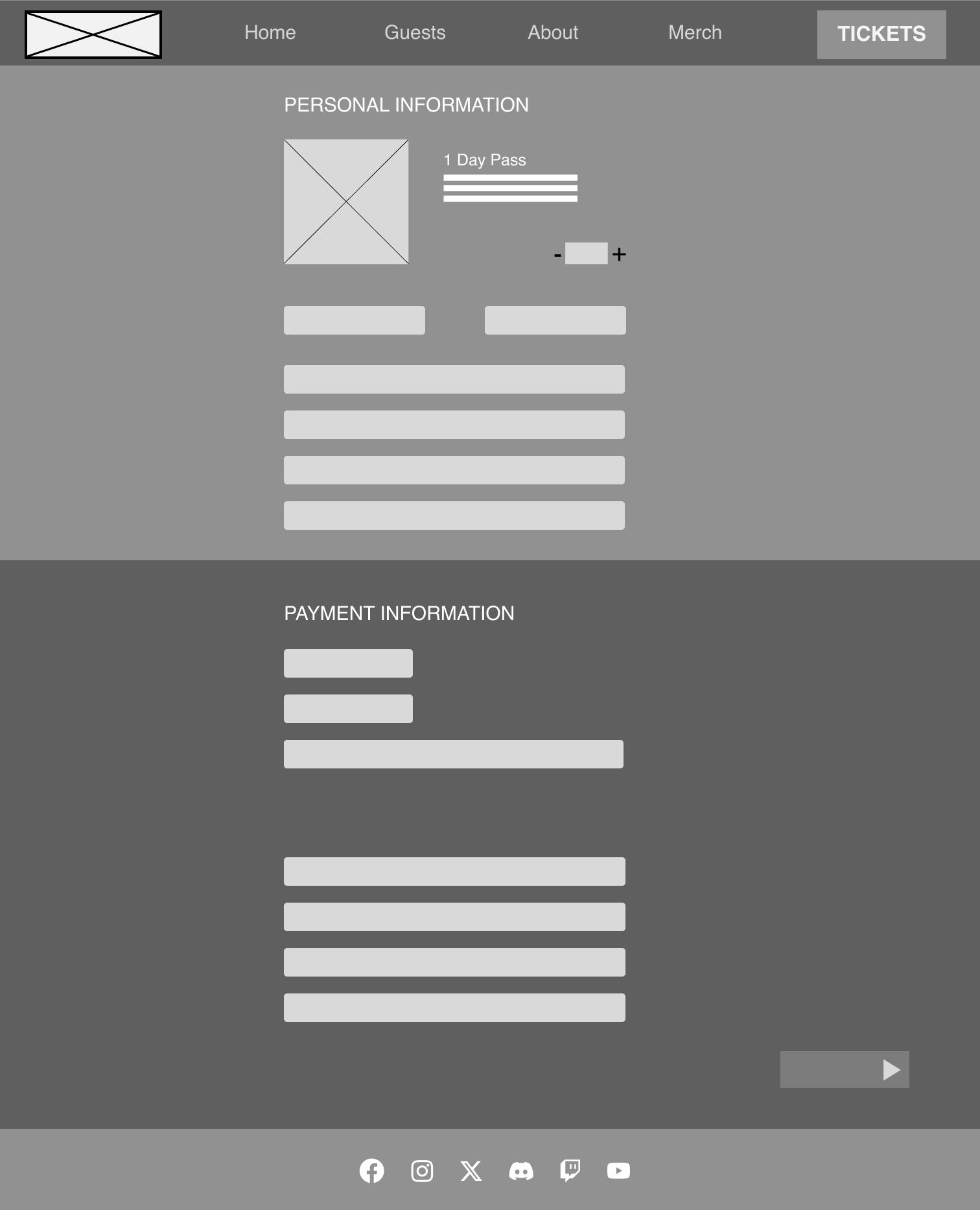 Along with the clear menu within the header, there is also a large CTA which has stayed in the same place as it was on the low-fidelity designs. The design of the CTA features a larger point size, and a bolder weight and is sat on a bright button that contrasts with the dark design colour of the wireframe, all of these features help the CTA to stand out so that it is a very prominent part of the webpage and header. This is an example of the Von Restorff effect which helps to guide the user’s eye to a focal point, which in this case is the CTA. The steps within the ticket purchase process have also been shortened by including the personal information and payment information on the same page so that the user does not get overwhelmed with the steps it takes to reach the goal of ticket purchases.