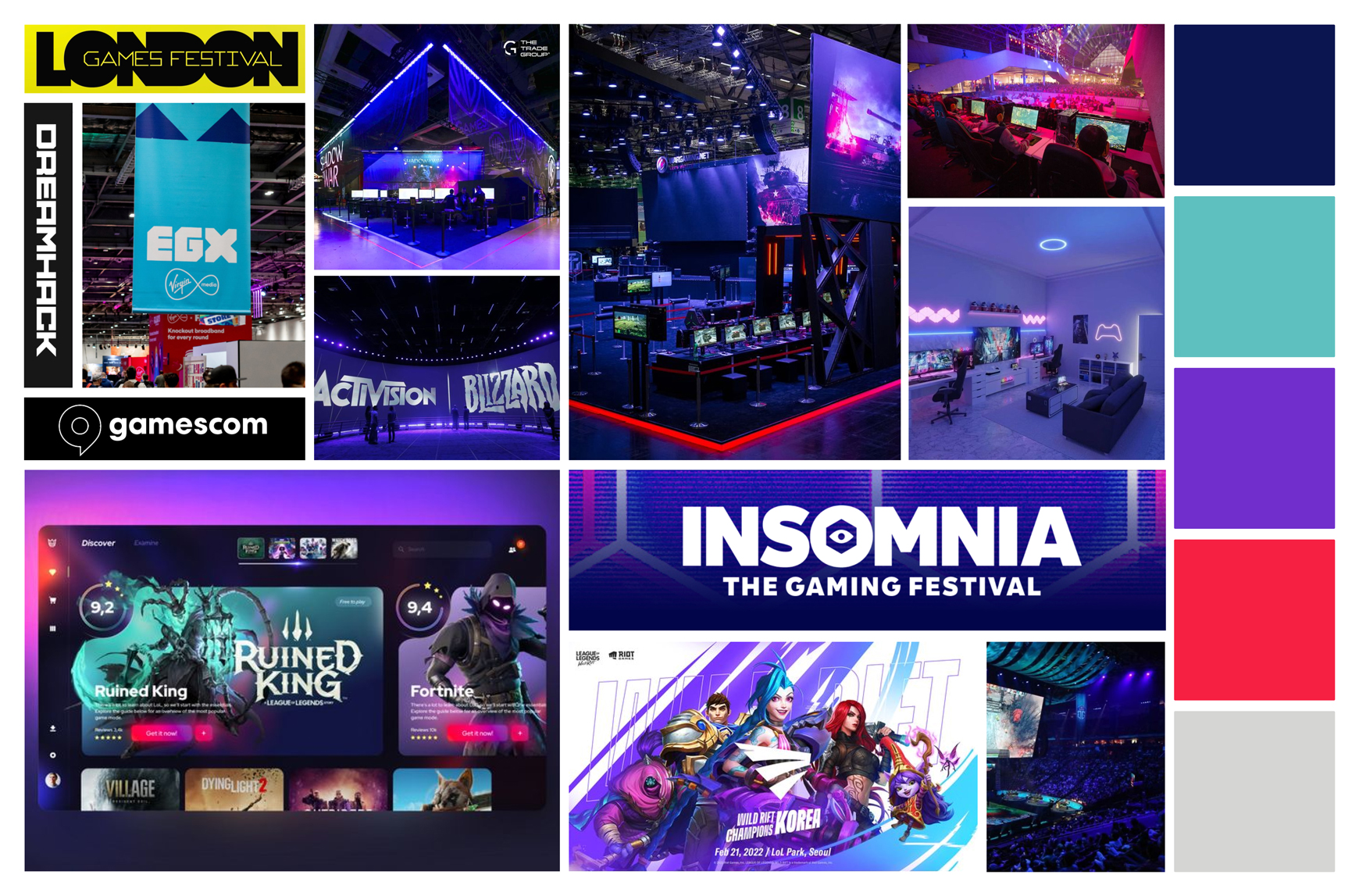 The mood board for the festival is created from a compilation of imagery surrounding the festival gaming theme, looking at other UI screenshots, other festival logos and typography, colours and imagery from the gaming and E-sports world to make sure the high-fidelity version feels appropriate to the theme and gives the user a sense of familiarity, leading to an increase in engagement. There are several benefits for using mood boards within the UI design process, it creates a tone for the brand early on, creating a clear direction that the visual design will go; which can be especially important if the design has to go another designer working on the same project. Another benefit to using mood boards within the design process is that there are fewer changes further down the line, they are an effective way to creatively plan ‘Moodboards can be used to get early buy-in to core visual design elements from product owners and clients, resulting in fewer revisions or changes in direction later on.’