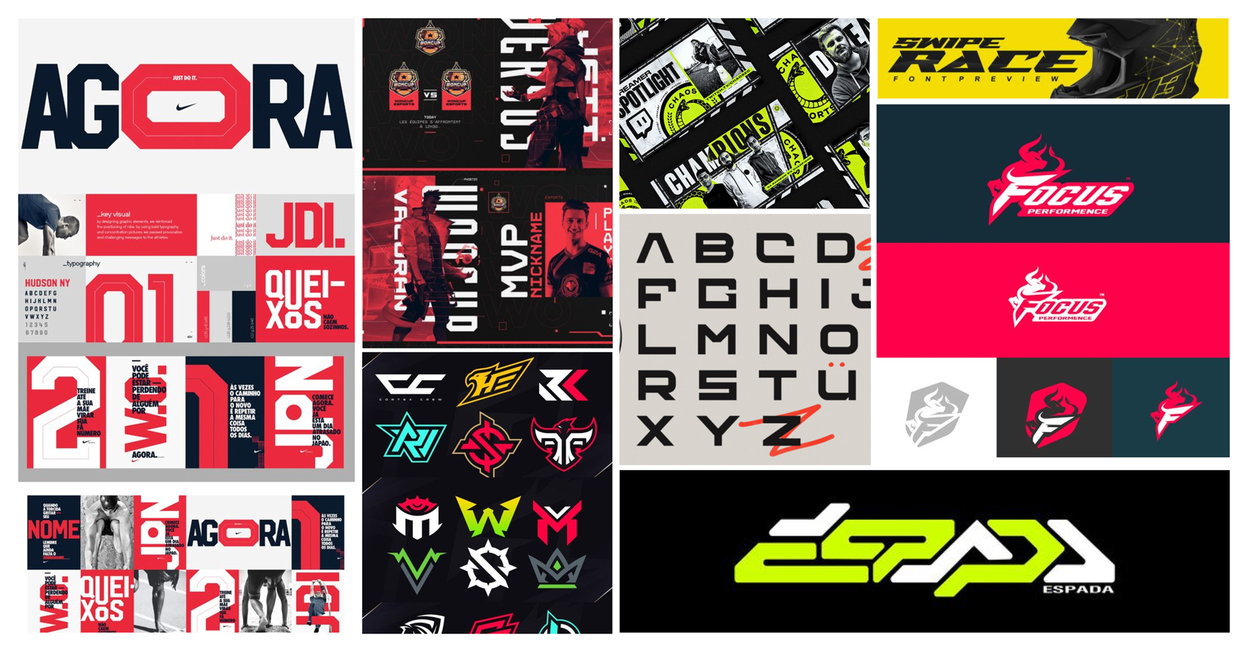 Typography plays an essential role within user experience and user interface design, the choice of fonts and typefaces can make or break a design. Type choices should be clear and legible while fitting within the theme of the overall brand. E-sports branding typically follows a lot of the same stylisation and direction of traditional sports branding, with similar elements due to their competitive aspect, this is heavily reflected within the typography choices. A typography mood board has been compiled by looking at different gaming and sports typography to give a clear visual representation of the direction of the type choices moving into high fidelity.