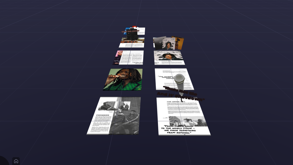 One of the key ways the augmented reality experience was elevated was through the considered use of 3D models, which were either sourced from existing 3D model libraries or modelled and textured independently using Blender. These models were not included purely for visual enhancement, but were instead designed to reinforce the themes and narratives of the accompanying articles. For the article exploring The Grime Era, a 3D microphone model was created to act as a symbolic representation of MC culture, pirate radio, and early grime sets. While microphones are commonly associated with music more broadly, in this context the model functions as a specific cultural reference, grounding the AR interaction in the history and practices of grime music. The model is further supported by surrounding 3D typography featuring selected lyrics from Skepta’s Shutdown, adding an additional layer of meaning and reinforcing the connection between the physical magazine and the digital overlay.