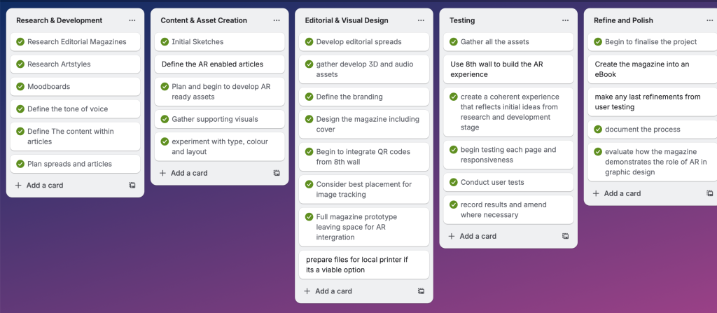 One of the most important things that was created during the proposal stage was the Trello mood board which allowed me to track weekly deadlines and schedules, this allowed time towards the end of the production piece to test, fix and improve any of the features within the experience, the weekly progress tracking also allowed me ensure that I had sufficient time to plan, design and create the magazine and send it off to print over the festive period.