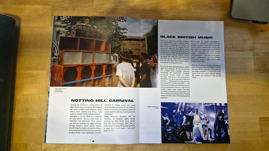 After completing the research and development stage, I began the process of creating the magazine. The first step following research was to develop sketches for each spread, which allowed me to determine the content layout, hierarchy, and key elements for every page. This planning stage was essential for ensuring that both the print and AR components could coexist seamlessly. I then compiled a series of high-contrast, high-quality images and used ChatGPT to generate the copy for each article, ensuring that all textual and visual assets were ready for use. Additionally, a collection of quotes from Black British music artists was created in Illustrator, providing further cultural context and visual interest for the spreads.