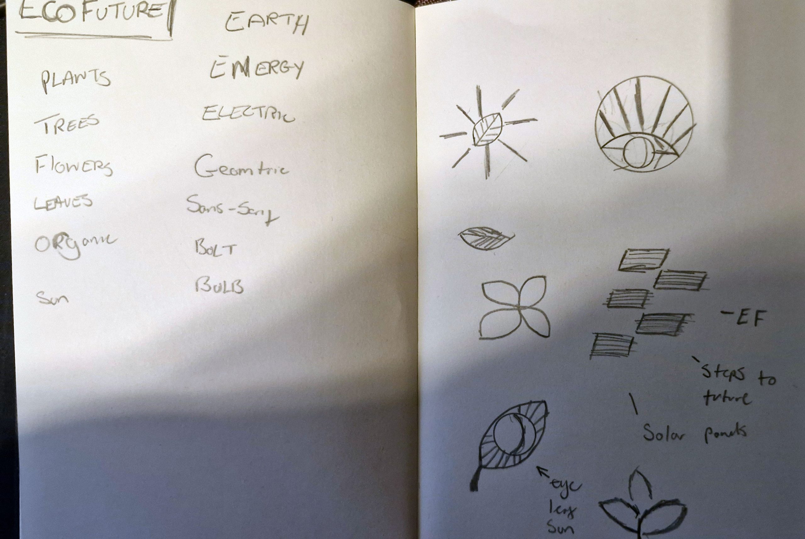 The logo design process began followed on from my early design prototyping with sketching and word association in my sketchbook, looking at a series of words that felt suitable for the brand and how I could turn them into some initial concept sketches, although there were only a few sketches it allowed me to get initial thoughts and ideas into a clear visual before jumping straight into digital software. While I was in the process of sketching ideas, I constantly referred to the previously created EcoFuture style scape to make sure I stayed on brand, I could visualise the direction that the brand was headed. I felt the appropriate direction would be to have an icon paired with a sans serif type.