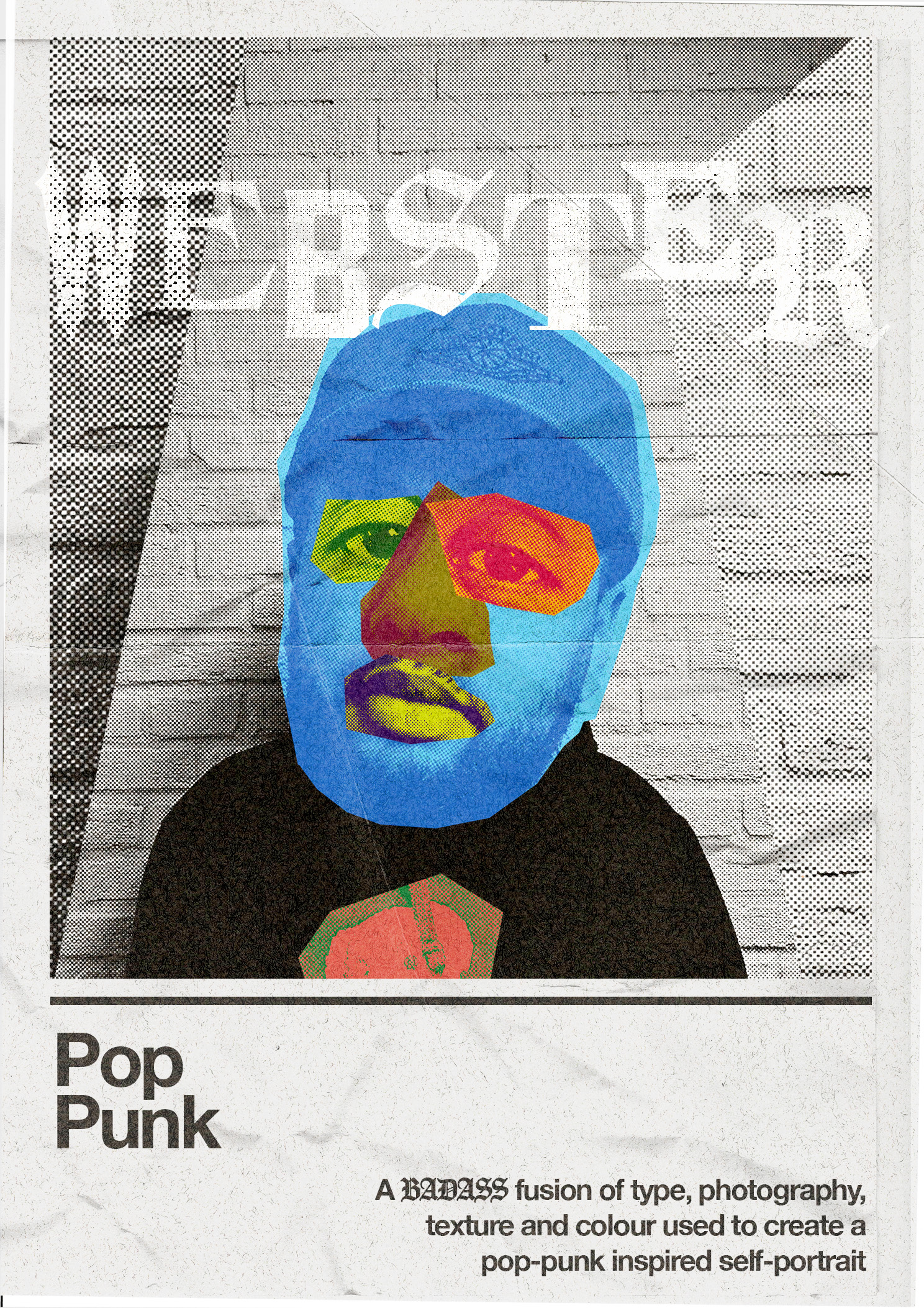 The first self portrait is completely inspired from my passion in the music genre Grime, which extends outside of music, into fashion and culture. Grime was born in London and I grew up with it, so I feel heavily involved with it. Grime is known as the new punk due to it being underground with a rebellious nature, I used this concept to create a Sex Pistol’s style collage using a mixture of different textures, facial features, colours and effects within photoshop. ‘Webster’ at the top of the poster showcases an each letter in a different typeface to create an interesting mashup that feels uniquely suited to the Punk/Grime genre and further enforces the mashup style I was trying to achieve.