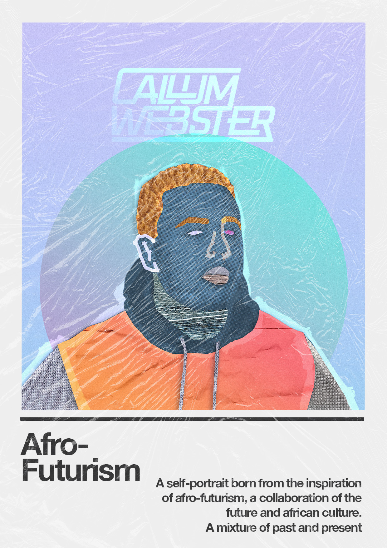 The second portrait was a result of trying to learn about new styles and I stumbles across a movement known as Afro-Futurism, which is a culmination of African culture and heritage . The reason why I chose 2 complete opposite directions was based on looking at the differences between the black British experience and the African experiences and styles differences produced. I collected some photographs and scans of different textures and materials to incorporate into this collage which allowed the portrait to feel true to myself and to the Afro-Futurism art movement. I also decided to add one of my typographic logos to this portrait which felt appropriate due to the futuristic style of the logo and how both pieces complimented each other.