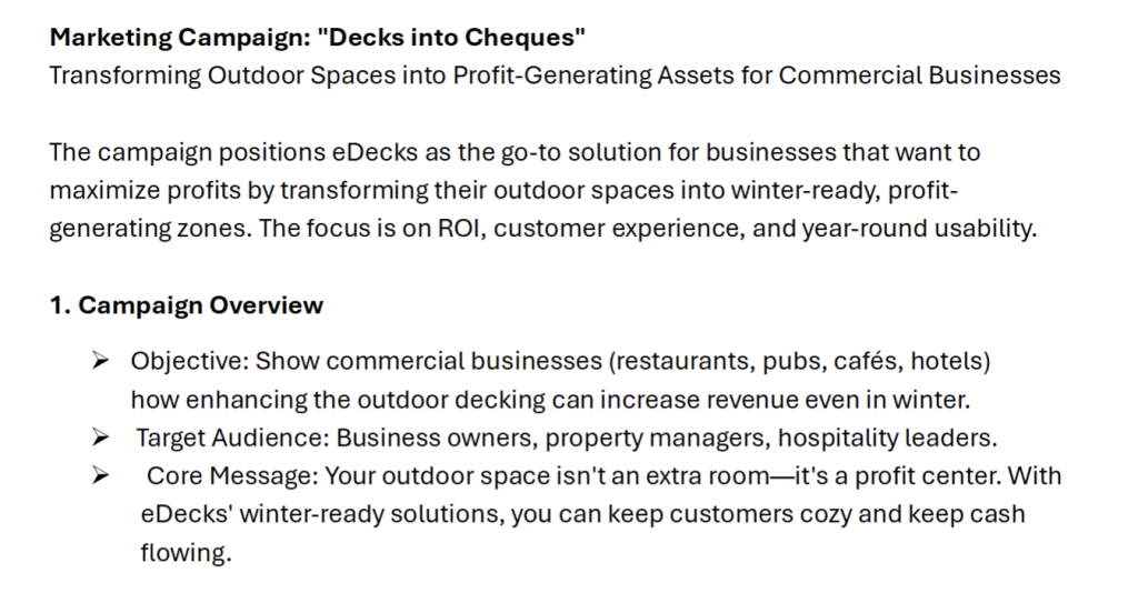 eDecks’ current target audience, which has been provided by the business itself, consists of homeowners, gardeners, hobbyists and small-scale landscapers, which looks directly at the business-to-consumer model that they currently use. Whilst looking at the target audience, it was also important to look at the competitors to gain a clearer understanding of their winter strategies and target audience. Looking at B&Q due to their similarities within the industry and product range, ‘It really is an incredibly broad audience. From first-time buyers, to families renovating and even to those renting their homes. B&Q connect with so many different types of homes.’ They share a very similar demographic with eDecks. Whilst working with the marketing group and the campaign ‘Decks into Cheques’, the target audience had been narrowed down to business owners, managers, and hospitality leaders to help promote the eDecks services and products to more businesses nationwide.