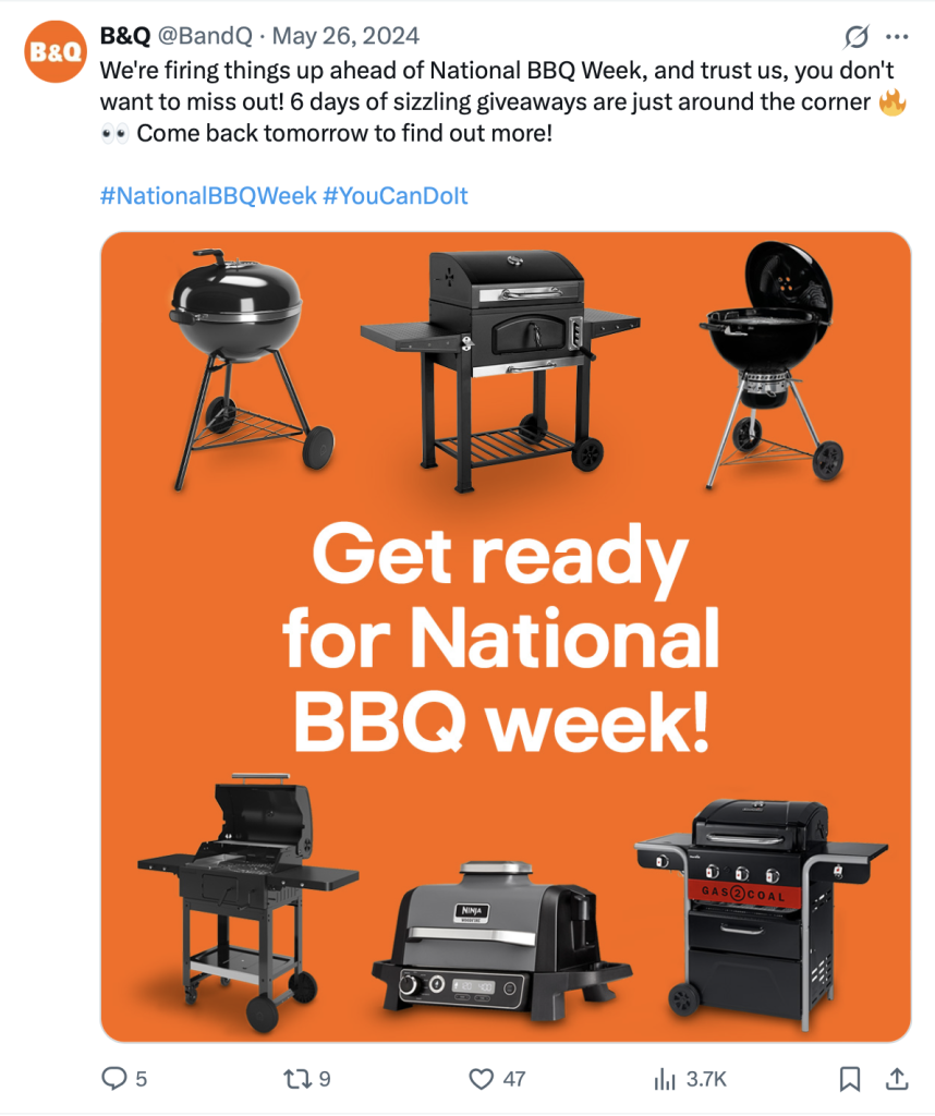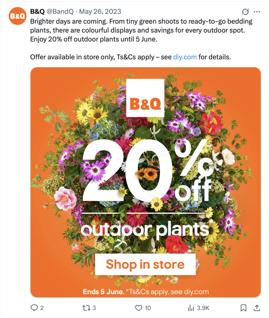 One of the things that stands out within the B&Q social media posts is the continuity between them, each post uses brand elements to create a cohesive series of posts. Below shows just 6 examples out of many, and these span a year, showing the longevity of their brand presence. The striking warm orange is a signature colour used in their logo and shop front and has been cleverly utilised within their social posts to create bold posts that draw the viewer’s eye, leading to more clicks and website visits. B&Q’s use of their brand colour, their brand typeface and appropriate imagery work seamlessly together to create an engaging and successful social media presence; which is something that will heavily influence the ‘decks into cheques’ social media campaign for eDecks, by utilising the pre existing brand guidelines to create a cohesive startegy that works across different social media posts and promotional videos.