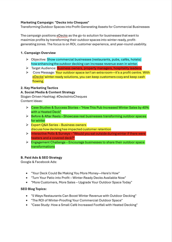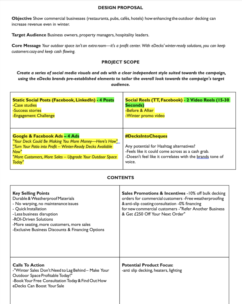 The documents shown are the initial marketing idea sent to us by the marketing group, which detailed their whole marketing idea that they would present to eDecks. It was our job to then take that information and determine where we could use graphic design knowledge to further push their marketing campaign. The marketing document(images 1 & 2) looked at a general campaign overview, the key marketing tactics that they planned to focus on, promotions and incentives to further push the campaign and also a structured timeline of how the campaign would be launched; from this, we broke down their document and colour coded different pieces of information, blue highlights being key information, green highlights being the work that would be prioritised, yellow being the things that would be looked at if time allowed. Once our design group had broken the marketing campaign down, we were able to create a document that detailed our role in the campaign with a project scope detailing what we would create, and the information content that would be displayed to help the marketing group execute the social media, content strategy and paid advertisements parts of their overall campaign. This development was a crucial piece of communication that allowed both parties to clearly understand what was expected and what work would be created, resulting in fewer complications down the line.