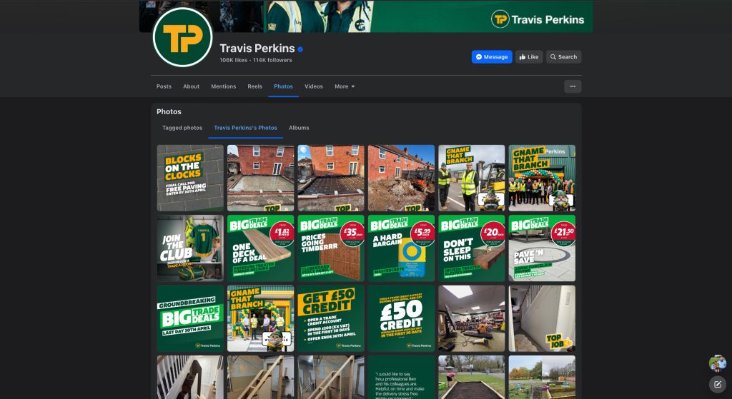When looking at the social media post grid above for each company, it is directly visible that Travis Perkins has a much more professional approach to their marketing strategy, emphasising a good use of the brand’s style, incorporating brand colours, type, consistent similarities in composition and layout, paired with appropriate imagery. Screwfix showcase a series of posts which do not correlate with each other; if these posts were to be seen on a social media timeline, there would be no clear evidence for the audience to determine the company that it was posted by, although travis perkins do not showcase their logo in the social media posts, the use of brand style across all posts allow them to be identified as a part of a larger visual ecosystem, allowing the audience to distinguish the brand from a single post.