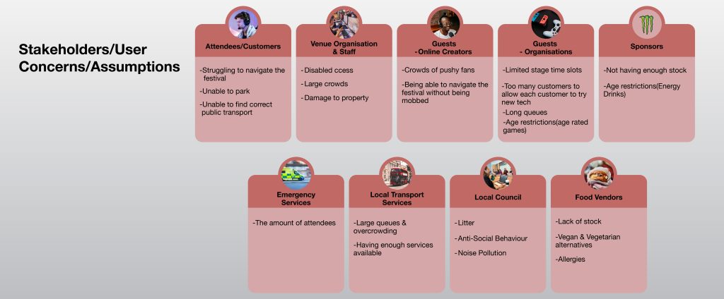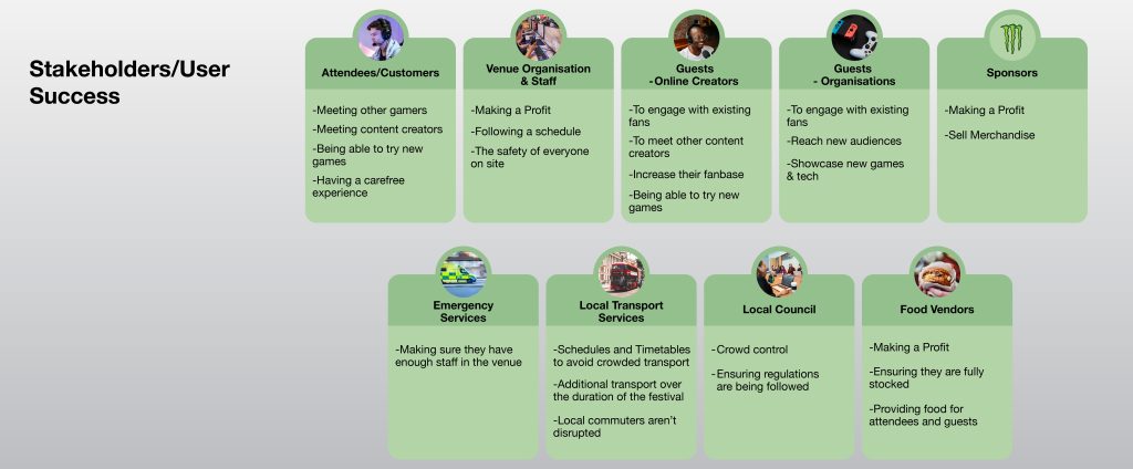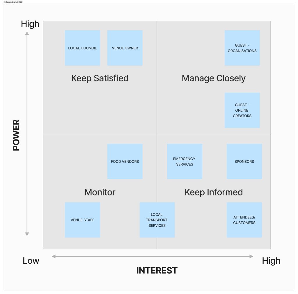 The stakeholders are the groups of individuals or organisations that have a stake in the festival, which consists of an interest or influence on the direction the festival takes. The stakeholder’s concerns and goals need to be taken into consideration to create a more effective user experience for all parties involved. Below is some information on the success and and concerns of each type of stakeholder involved and the power and influence they have on a project which determines the decisions that should be made when designing.