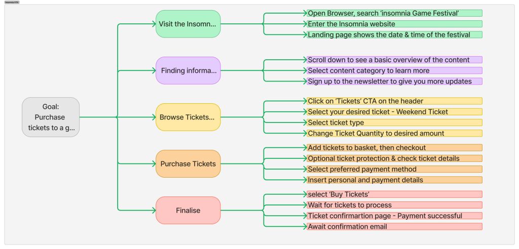 The main competitor of the festival is Insomnia Gaming Festival, who use a very functional website which has been specially designed with accessibility in mind, the below hierarchal task analysis shows how streamlining the website(www.insomniagamingfestival.com) works to reach the user’s goal, along with some pros and cons of how effective the site is to the user.
