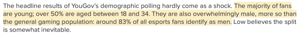 Walker, P. (2023) The Story Mob and UKIE report analyses UK esports audiences and growth. Available Online: https://esportsinsider.com/2023/09/story-mob-ukie-uk-esports-report#:~:text=The%20majority%20of%20fans%20are,esports%20fans%20identify%20as%20men. [Accessed On 25/2/2024]